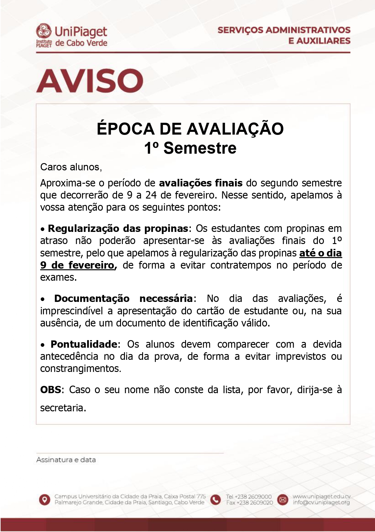 UniPiaget informs that the final examination period for the 1st semester will take place from February 9 to 24.