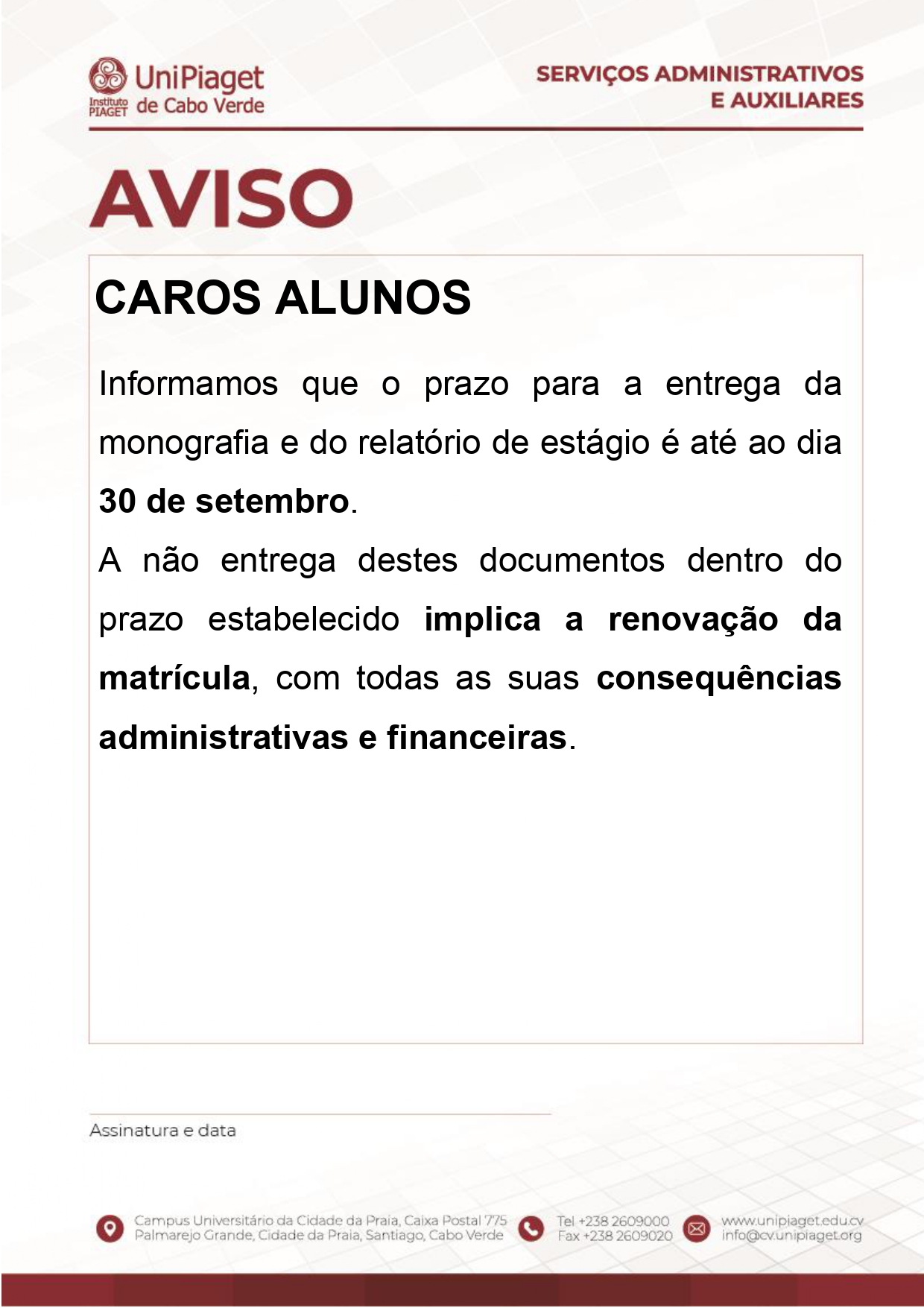 A Universidade Jean Piaget de Cabo Verde informa que o prazo para a entrega da monografia e do relatório de estágio decorre até ao dia 30 de setembro.