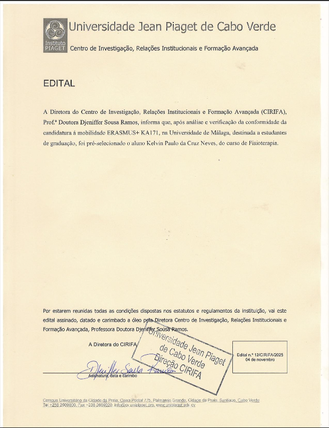A Diretora do Centro de Investigação, Relações Institucionais e Formação Avançada (CIRIFA), Prof. Doutora Djeniffer Sousa Ramos, informa que, após análise e verificação da conformidade da candidatura á mobilidade ERASMUS+ KA171, na Universidade de Málaga, destinada a estudantes de graduação, foi pré-selecionado o aluno Kelvin Paulo da Cruz Neves, do curso de Fisioterapia.