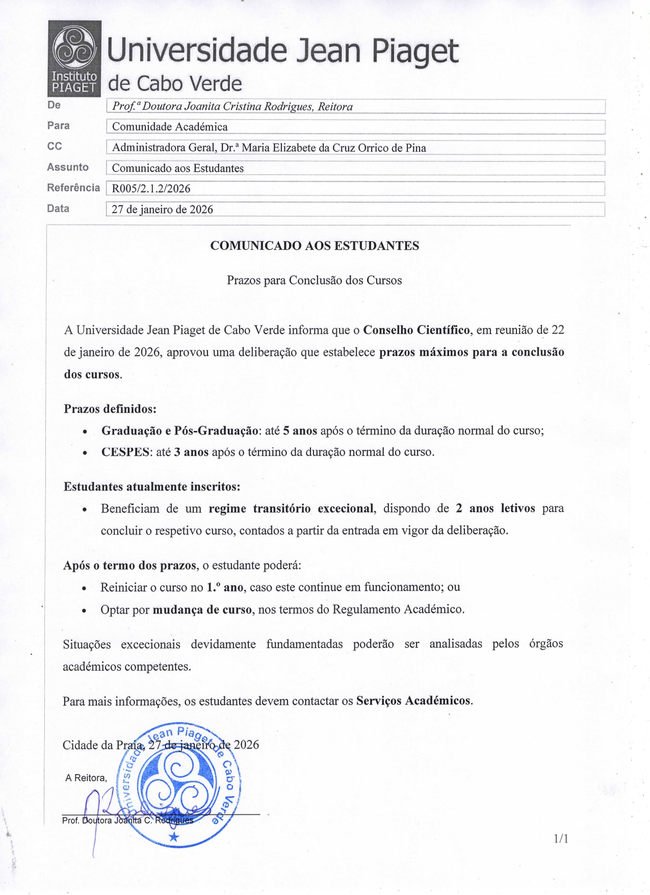 Jean Piaget University of Cape Verde informs that maximum deadlines for the completion of degree programs have been established, in accordance with a decision of the Scientific Council.