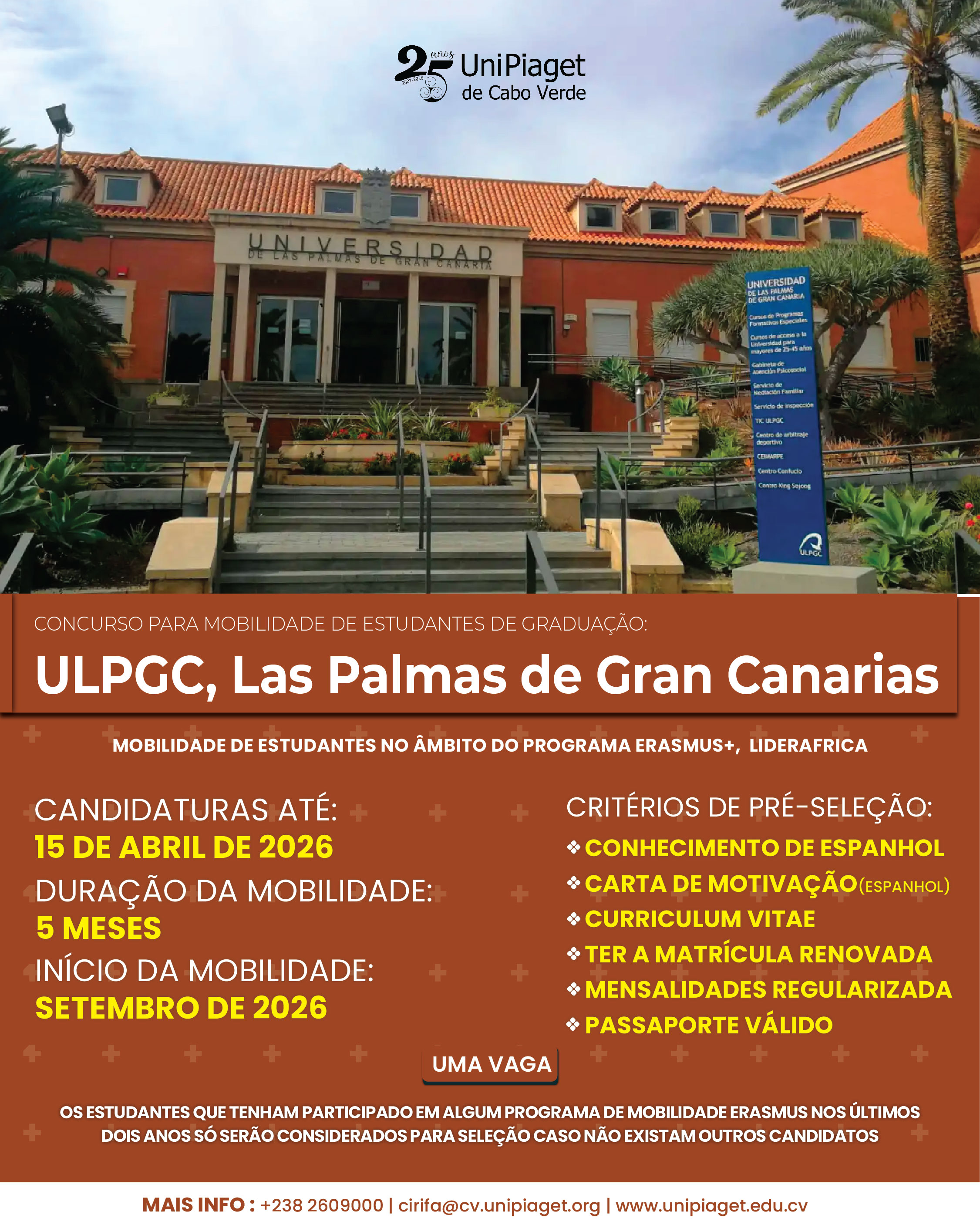The Jean Piaget University of Cape Verde informs that applications are open for academic mobility at the University of Las Palmas de Gran Canaria.