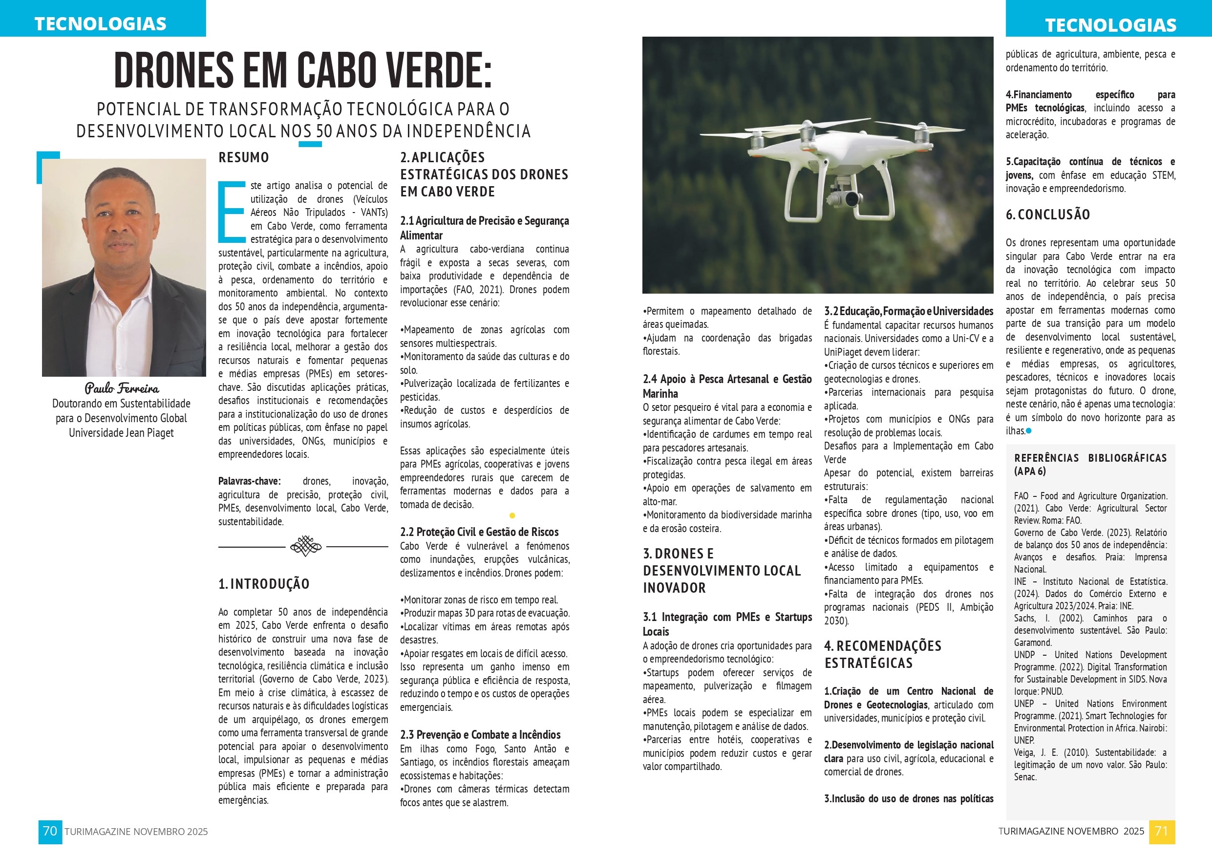 A Turi Magazine de novembro (Edição nº 104) destaca um artigo da autoria de Paulo Ferreira, doutorando em Desenvolvimento e Sustentabilidade Global pela Universidade Jean Piaget de Cabo Verde, sobre o potencial dos drones para impulsionar o desenvolvimento local no país, no contexto dos 50 anos de independência.